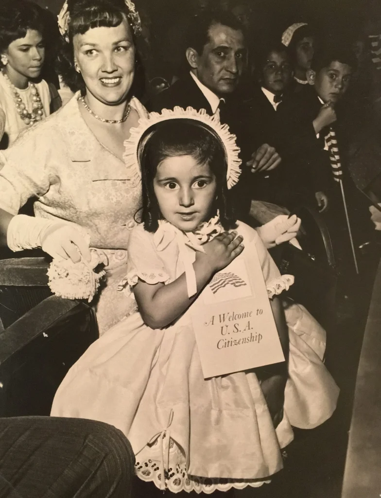 Το μελαχρινό κοριτσάκι με το λευκό φόρεμα που θυμίζει βαπτιστικό ρούχο και την ασορτί κορδέλα στα μαλλιά, κρατά με ακουμπισμένο το δεξί του χέρι στο σημείο της καρδιάς, ένα χαρτί με την αμερικανική σημαία και τη λεζάντα «A Welcome to US Citizenship», κοιτώντας κατάματα τον φωτογραφικό φακό.