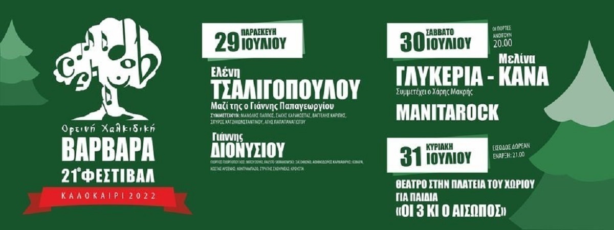 Το Φεστιβάλ Βαρβάρας επιστρέφει για ακόμα ένα καλοκαίρι στην ορεινή Χαλκιδική και μας προσκαλεί όλους να απολαύσουμε ένα μοναδικό διήμερο συναυλιών στις 29 & 30 Ιουλίου 2022.