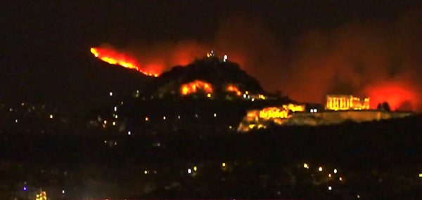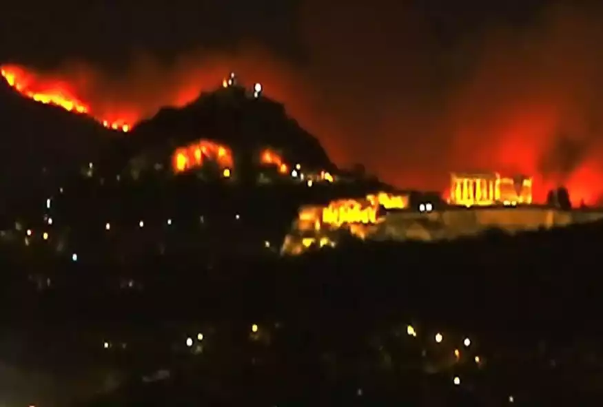 Τα πλάνα που καταγράφονται είναι πραγματικά σοκαριστικά με την τηλεόραση του ΣΚΑΪ, να προβάλει την τρομακτική εικόνα του Παρθενώνα που έχει βαφτεί «κόκκινος» από την πυρκαγιά που καίει στην Πεντέλη και έχει καλύψει με καπνούς και στάχτη σχεδόν όλη την Αττική.