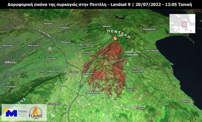 Με βάση εικόνα πολύ υψηλής ανάλυσης που ελήφθη από το δορυφόρο Landsat 9 την Τετάρτη 20.07.2022 στις 12:05 τοπική ώρα (Εικόνα 1), την οποία ανέκτησε και επεξεργάστηκε πριν από λίγο η πυρομετεωρολογική ομάδα FLAME του Εθνικού Αστεροσκοπείου Αθηνών (ΕΑΑ) / meteo.gr, η νεότερη εκτίμηση για την έκταση που επηρέασε η δασική πυρκαγιά της Πεντέλης είναι περίπου 20.350 στρέμματα.