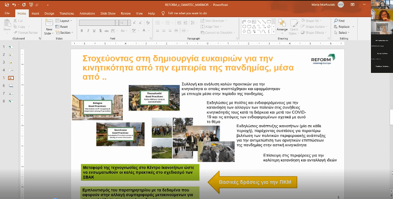 Κατά τη διάρκεια της συνάντησης παρουσιάστηκαν οι καλές πρακτικές που αναδείχθηκαν από τους εταίρους του έργου REFORM, ενώ η Δρ. Κωνσταντία Μπέσσα εκ μέρους της Περιφέρειας Κεντρικής Μακεδονίας και η Δρ. Μορφουλάκη εκ μέρους του επικεφαλής εταίρου του έργου παρουσίασαν το Παρατηρητήριο και το Κέντρο Υποστήριξης των Σχεδίων Βιώσιμης Αστικής Κινητικότητας της Περιφέρειας Κεντρικής Μακεδονίας. Επίσης έγινε παρουσίαση από την Χρυσάνθη Κισκίνη εκ μέρους του Περιφερειακού Ταμείου Ανάπτυξης Κεντρικής Μακεδονίας των καλών πρακτικών και των εργαλείων του έργου «e-smartec», καθώς και ανάλυση της χρήσης εργαλείων συμμετοχικού σχεδιασμού για την βελτιστοποίηση εγκεκριμένων έργων της Περιφέρειας Κεντρικής Μακεδονίας. Ακολούθησε διαδραστική συζήτηση με τους συμμετέχοντες, κατά την οποία αναδείχθηκε η σημασία του συμμετοχικού σχεδιασμού στην υλοποίηση έργων αστικής κινητικότητας από τους φορείς.