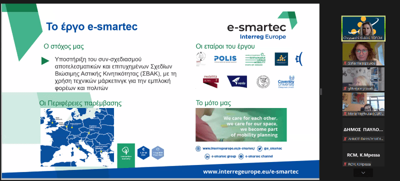 Η εκδήλωση πραγματοποιήθηκε στο πλαίσιο των πρόσθετων δράσεων του έργου REFORM – “Integrated REgional Action Plan For Innovative, Sustainable and LOw CaRbon Mobility”, το οποίο συγχρηματοδοτείται από το Πρόγραμμα Ευρωπαϊκής Διαπεριφερειακής Συνεργασίας INTERREG EUROPE2014-2020. Στην εκδήλωση συμμετείχαν εκπρόσωποι των Τεχνικών Υπηρεσιών των Δήμων της Περιφέρειας Κεντρικής Μακεδονίας και σχετικών με τη βιώσιμη κινητικότητα φορέων της Θεσσαλονίκης, καθώς και εκπρόσωποι του έργου «e-smartec» του Προγράμματος Ευρωπαϊκής Διαπεριφερειακής Συνεργασίας INTERREG EUROPE 2014-2020. Στόχος της εκδήλωσης ήταν η κατανόηση της σημασίας του συμμετοχικού σχεδιασμού για την αστική βιώσιμη κινητικότητα εντός της Μητροπολιτικής Ενότητας Θεσσαλονίκης όπως αυτή προέκυψε μέσα από την εμπειρία της πανδημίας, καθώς και η υποστήριξη των Δήμων στο σχεδιασμό και την υλοποίηση δράσεων συμμετοχικού σχεδιασμού.
