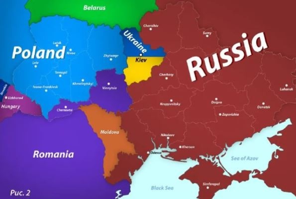 Ακολουθεί ο δεύτερος χάρτης που δείχνει μια συρρικνωμένη Ουκρανία με τα σύνορα να περικλείουν μόνο την περιφέρεια του Κιέβου, με τα υπόλοιπα εδάφη να έχουν προσαρτηθεί από την Πολωνία, την Ουγγαρία, τη Ρουμανία και κυρίως τη Ρωσία. «Δυτικοί αναλυτές πιστεύουν ότι στην πραγματικότητα θα μοιάζει κάπως έτσι», γράφει στην ανάρτησή του για τον δεύτερο χάρτη ο Μεντβέντεφ, χωρίς να διευκρινίζει πάντως σε ποιους αναλυτές αναφέρεται.