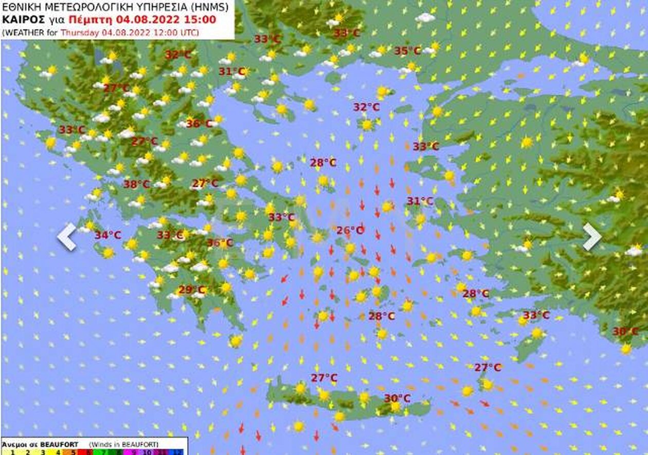 Η θερμοκρασία δεν θα σημειώσει αξιόλογη μεταβολή και θα φτάσει, στα ηπειρωτικά τους 36 με 37 και κατά τόπους στα δυτικά τους 38 βαθμούς, στα περισσότερα νησιά τους 34 με 36 βαθμούς, ενώ στις Κυκλάδες και τη βόρεια Κρήτη δεν θα ξεπεράσει τους 31 με 33 βαθμούς Κελσίου.