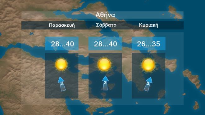 Η θερμοκρασία την Παρασκευή στους 39 με 40 και τοπικά στη Θεσσαλία και την ανατολική Στερεά τους 41 βαθμούς και στα νησιά τους 36 με 37 βαθμούς Κελσίου.