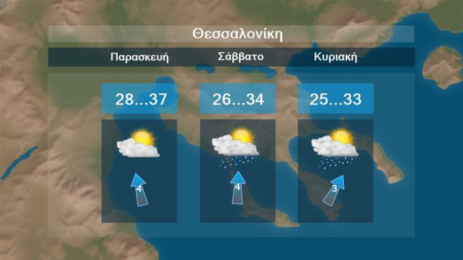 Στη Θεσσαλονίκη προβλέπονται τοπικές νεφώσεις με αστάθεια το Σαββατοκύριακο. Η θερμοκρασία θα έχει μέγιστες τιμές περί τους 33 με 37 βαθμούς Κελσίου.