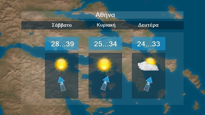 Στην Αθήνα τις επόμενες ημέρες προβλέπεται σχεδόν αίθριος καιρός . Η θερμοκρασία θα κυμανθεί περί τους 33 με 39 βαθμούς Κελσίου.