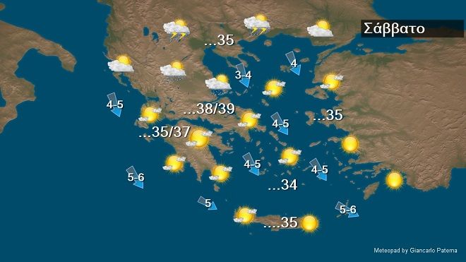Γενικά αίθριος καιρός με λίγες νεφώσεις που βαθμιαία από το μεσημέρι στα ηπειρωτικά θα πυκνώσουν και θα εκδηλωθούν τοπικοί όμβροι και μεμονωμένες καταιγίδες, κυρίως στα κεντρικά και βόρεια (εκτός της Θράκης). Τη νύχτα προς την Κυριακή, στην κεντρική και την ανατολική Μακεδονία τα φαινόμενα πιθανώς να είναι έντονα.