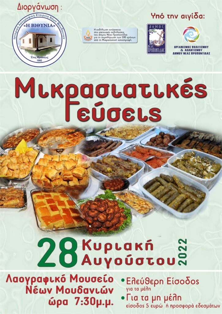 Η Ιστορική και Λαογραφική Εταιρεία Νέων Μουδανιών “Η Βιθυνία” σας προσκαλεί στην εκδήλωση «Μικρασιατικές Γεύσεις», την Κυριακή 28 Αυγούστου 2022 και ώρα 7:30μ.μ. στο προαύλιο του Λαογραφικού Μουσείο Νέων Μουδανιών.