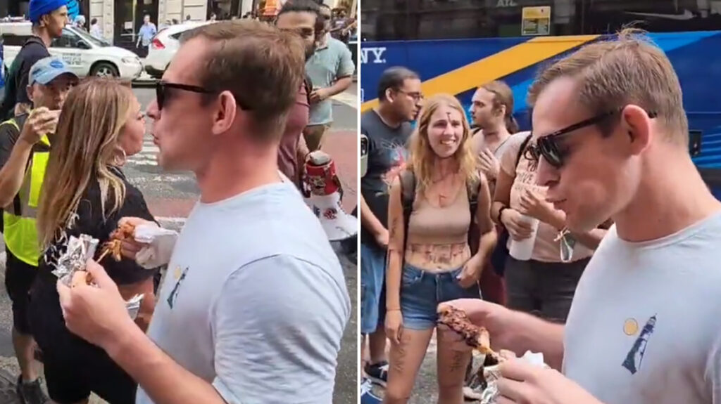 Το βίντεο, που δημοσιεύτηκε από τον λογαριασμό @ViralNewsNYC στο Twitter, δείχνει τον άνδρα να προκαλεί τους vegan δαγκώνοντας σιωπηλά κρέας στη διαδήλωση στο Μανχάταν το Σάββατο.