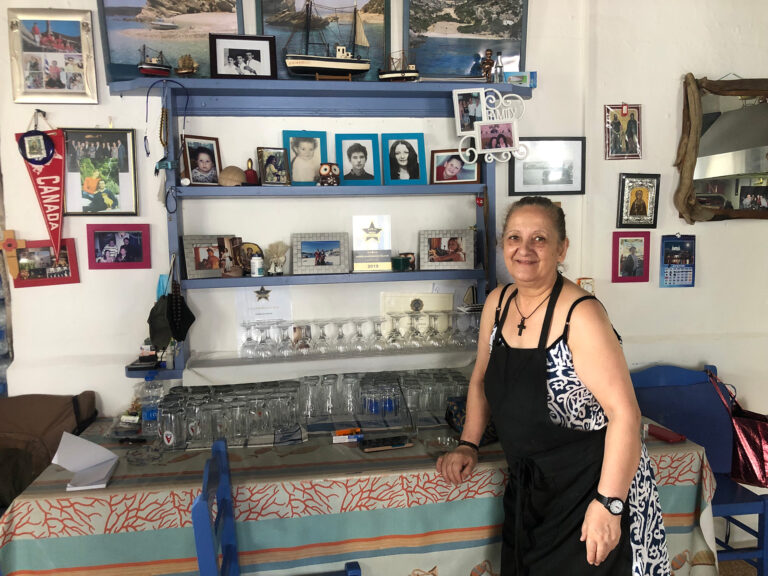 Η κυρία Δέσποινα Παντέλλου στο ταβερνάκι της, Du Moulin, στην κεντρική γραφική μινιόν πλατεία των Λειψών.