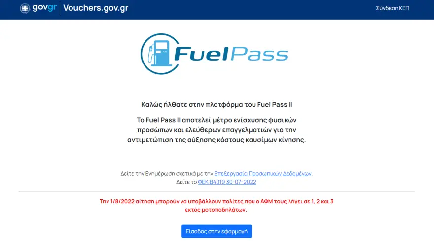 Περίπου 3 εκατομμύρια (2.963.261) Έλληνες έσπευσαν να υποβάλλουν την αίτησή τους στην πλατφόρμα Fuel Pass 2 μέχρι την 1η Σεπτεμβρίου, προκειμένου να λάβουν το ποσό ενίσχυσης για να καλύψουν το κόστος κατανάλωσης καυσίμων κίνησης των μηνών Ιουλίου, Αυγούστου και Σεπτεμβρίου.