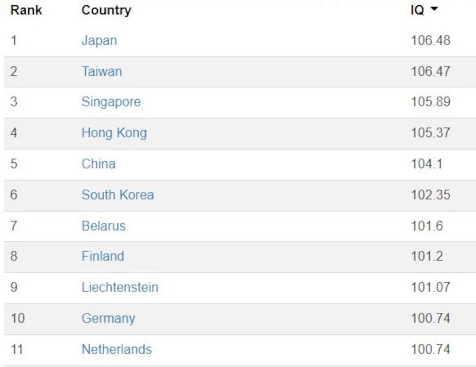 Σύμφωνα με μελέτη που έγινε το 2019, των ερευνητών Richerd Lynn και David Becker του Ινστιτούτου Ulster, οι υψηλότερες μέσες βαθμολογίες IQ ανήκουν στους Ιάπωνες, με τους πολίτες της Ταϊβάν και της Σιγκαπούρης να ακολουθούν κατά πόδας.