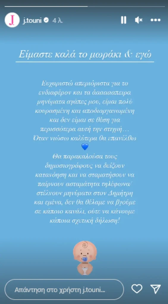 Στη συνέχεια, παρακάλεσε να σεβαστούν οι δημοσιογράφοι την ιδιωτικότητά τους και δήλωσε πως δεν θα ήθελε να μιλήσει σε κάποιο κανάλι. «Θα παρακαλούσα τους δημοσιογράφους να δείξουν κατανόηση και να σταματήσουν να παίρνουν τηλέφωνα/στέλνουν μηνύματα στον Δημήτρη και εμένα. Δεν θα θέλαμε να βγούμε σε κάποιο κανάλι, ούτε να κάνουμε κάποια σχετική δήλωση», αναφέρει η ανάρτηση.