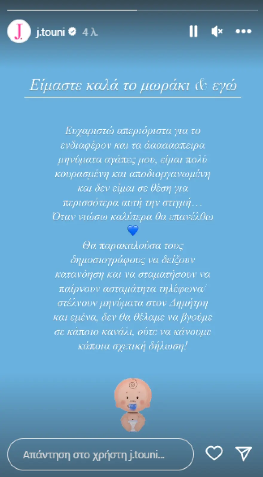 «Είμαστε καλά το μωράκι κι εγώ. Ευχαριστώ απεριόριστα για το ενδιαφέρον και τα άπειρα μηνύματα αγάπες μου. Είμαι πολύ κουρασμένη και αποδιοργανωμένη και δεν είμαι σε θέση για περισσότερα αυτή τη στιγμή. Όταν νιώσω καλύτερα θα επανέλθω» έγραψε.