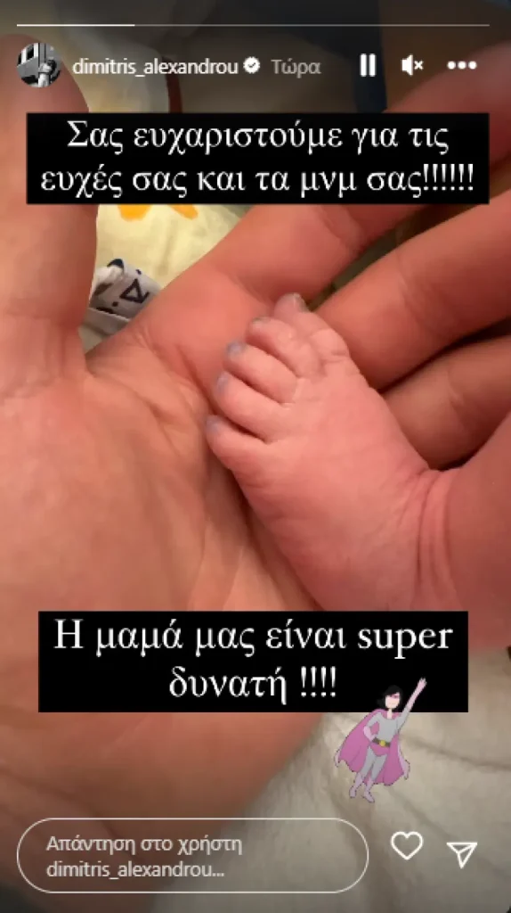 Συγκεκριμένα, ανάρτησε ένα στιγμιότυπο με τα πατουσάκια του μωρού και πάνω σε αυτή έγραψε: «Σας ευχαριστούμε για τις ευχές και τα μηνύματά σας. Η μαμά μας είναι super δυνατή».