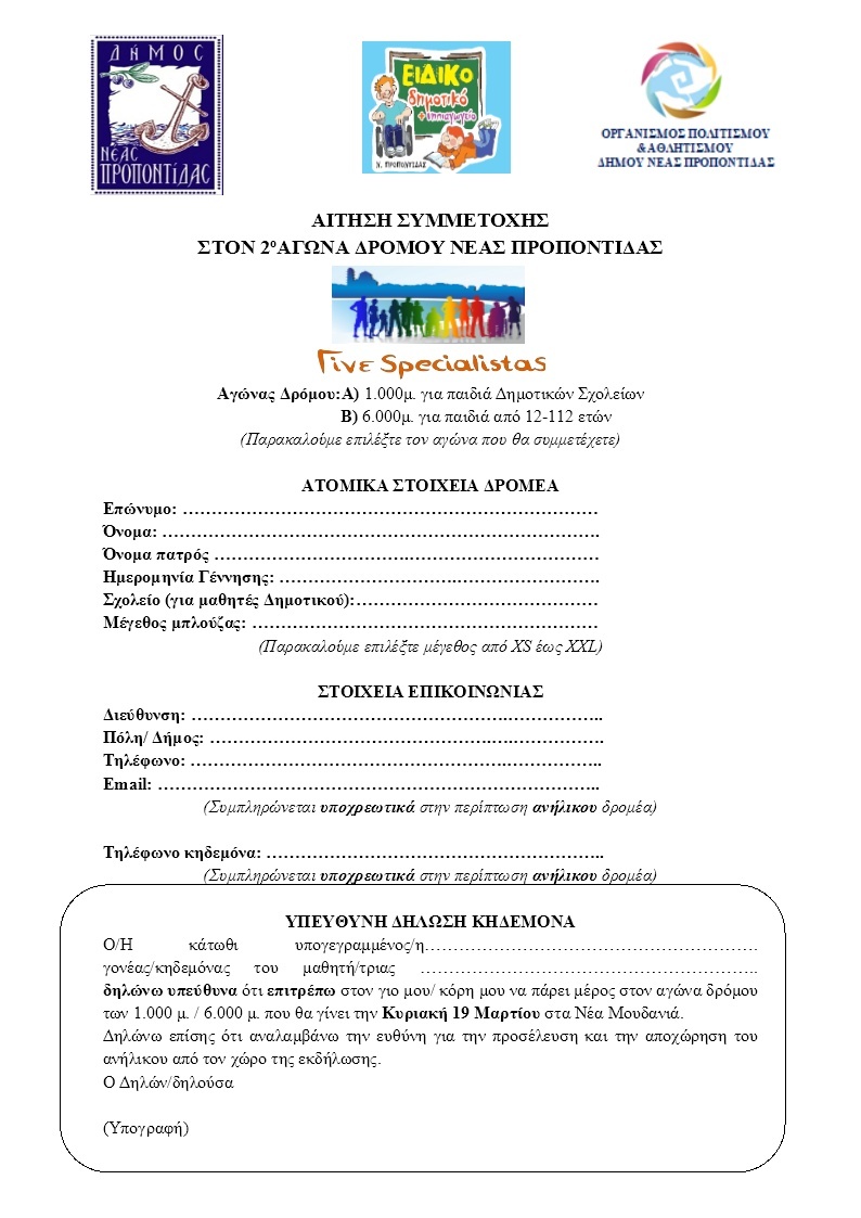 Ο Δήμος Νέας Προποντίδας και το Ειδικό Δημοτικό και Νηπιαγωγείο Νέας Προποντίδας σε συνεργασία με τον Οργανισμό Πολιτισμού και Αθλητισμού, διοργανώνουν τον 2ο Αγώνα Δρόμου «Γίνε Specialistas» και σας προσκαλούν να συμμετάσχετε.