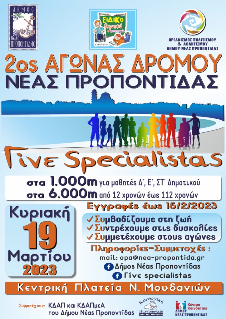 Ο Δήμος Νέας Προποντίδας και το Ειδικό Δημοτικό και Νηπιαγωγείο Νέας Προποντίδας σε συνεργασία με τον Οργανισμό Πολιτισμού και Αθλητισμού, διοργανώνουν τον 2ο Αγώνα Δρόμου «Γίνε Specialistas» και σας προσκαλούν να συμμετάσχετε.