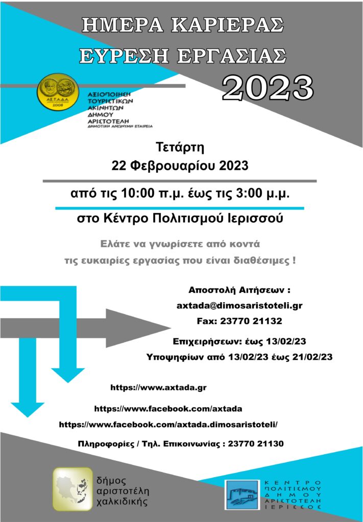 Μέχρι στιγμής εκπρόσωποι από 24 επιχειρήσεις που θα διαθέσουν πάνω από 100 θέσεις εργασίας θα βρίσκονται την Τετάρτη 22 Φεβρουαρίου 2023, από τις 10:00 π.μ. έως 15:00, στο Κέντρο Πολιτισμού Ιερισσού σε ειδικά διαμορφωμένο χώρο, αναζητώντας το κατάλληλο προσωπικό για να στελεχώσουν τα τμήματα τους.