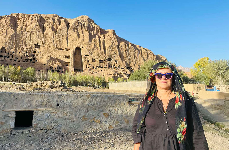 Η Αλέκα Μακρή στην περιοχή του Μπαμιγιάν, όπου το 2001 οι Ταλιμπάν ανατίναξαν δύο αγάλματα ύψους 50 μέτρων σκαλισμένα πάνω σε βράχο, τα οποία στέκονταν όρθια για πάνω από 1400 χρόνια, γνωστά ως οι Βούδες του Μπαμιγιάν. (Φωτ: Αρχείο Αλέκας Μακρή)