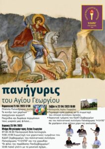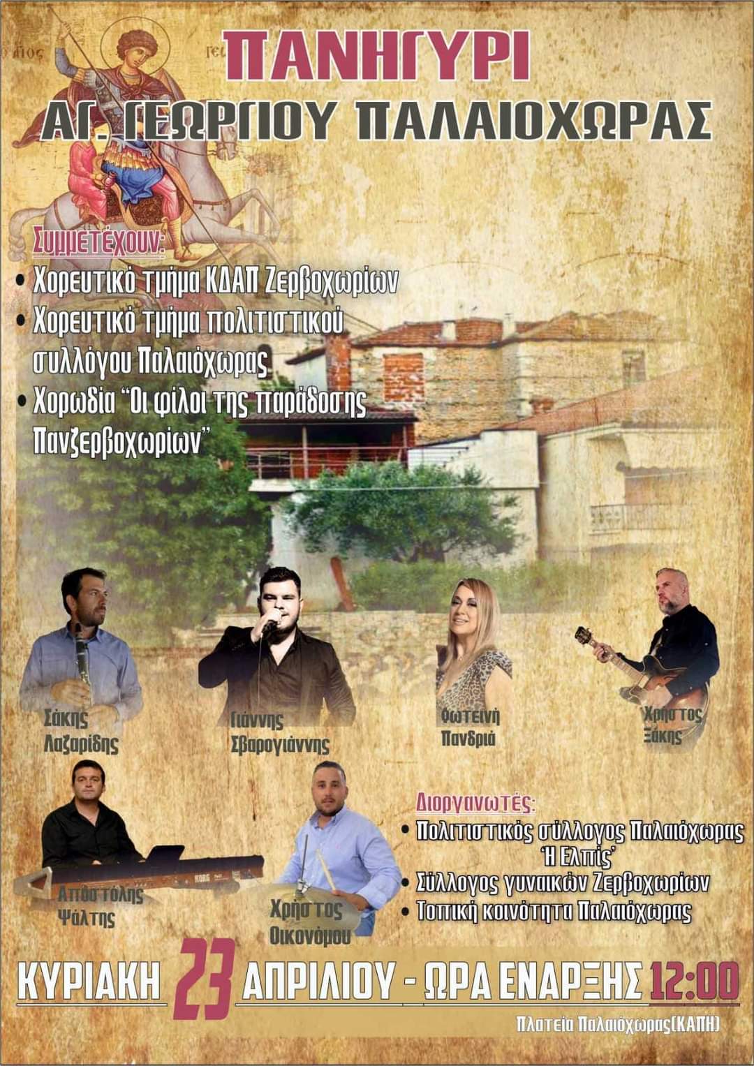 Ο Πολιτιστικός Σύλλογος Παλαιόχωρας Χαλκιδικής ” Η Ελπίς”, σε συνεργασία με τον σύλλογο γυναικών Ζερβοχωρίων και την τοπική κοινότητα Παλαιόχωρας, σας προσκαλούν στο πανηγύρι για την ημέρα του Αγίου Γεωργίου την Παρασκευή στις 21, το Σάββατο στις 22 και την Κυριακή στις 23 Απριλίου 2023.