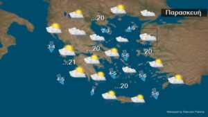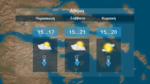Στην Αθήνα προβλέπονται νεφώσεις παροδικά αυξημένες με βροχή την Παρασκευή. Η μέγιστη θερμοκρασία θα κυμαίνεται περί τους 17 με 21 βαθμούς Κελσίου.