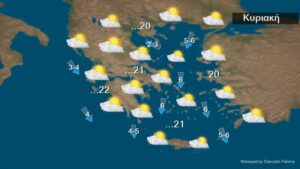 Στο νότιο Ιόνιο, τη Στερεά, τη Θεσσαλία, τις Σποράδες, την Πελοπόννησο και την ανατολική και νότια νησιωτική χώρα προβλέπονται νεφώσεις παροδικά αυξημένες με τοπικές βροχές και σποραδικές καταιγίδες. Τα φαινόμενα σταδιακά θα εξασθενήσουν και θα περιοριστούν στην Κρήτη. Στις υπόλοιπες περιοχές λίγες νεφώσεις πρόσκαιρα αυξημένες το μεσημέρι – απόγευμα στα ηπειρωτικά, όπου θα σημειωθούν τοπικοί όμβροι και μεμονωμένες καταιγίδες στα ορεινά. Οι άνεμοι θα πνέουν από βόρειες διευθύνσεις 3 με 5 και στα πελάγη τοπικά 6 μποφόρ ενισχυόμενοι στο Αιγαίο τις βραδινές ώρες. Η θερμοκρασία δεν θα σημειώσει αξιόλογη μεταβολή και θα φτάσει στα ηπειρωτικά τους 20 με 22 βαθμούς και στη νησιωτική χώρα 19 με 20 βαθμούς Κελσίου.