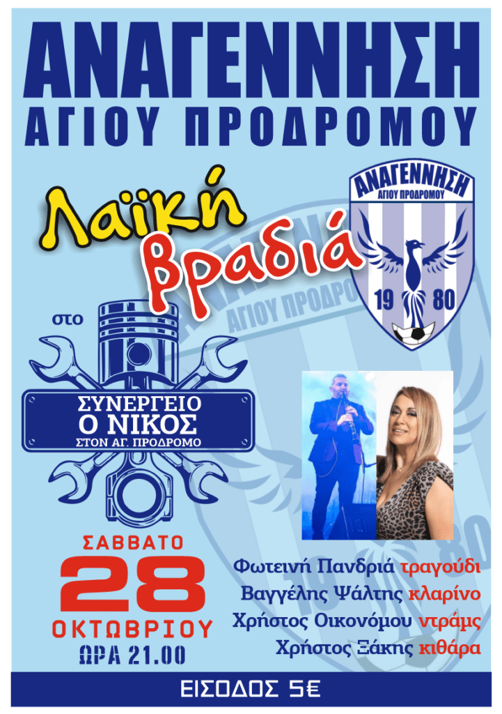 Αυτό το Σάββατο 28 Οκτωβρίου, την ημέρα της Εθνικής μας Εορτής, η Αναγέννηση Αγίου Προδρόμου σας καλεί στην μεγάλη λαϊκή βραδιά με την Φωτεινή Πανδριά, που θα πραγματοποιηθεί στο Συνεργείο “ΝΙΚΟΣ”, στον Άγιο Πρόδρομο, στις 21:00.