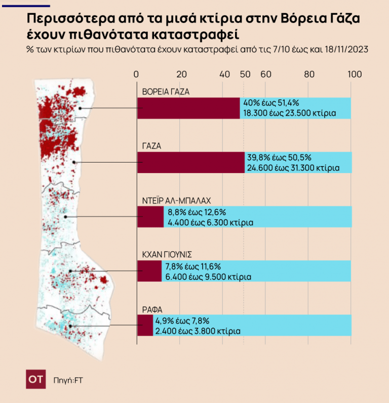Περισσότερο από ένα μήνα αργότερα, σχεδόν οι μισές δομές της περιοχής της Βόρειας Γάζας έχουν υποστεί σοβαρές ζημιές, δείχνει η ανάλυση των δεδομένων ραντάρ.