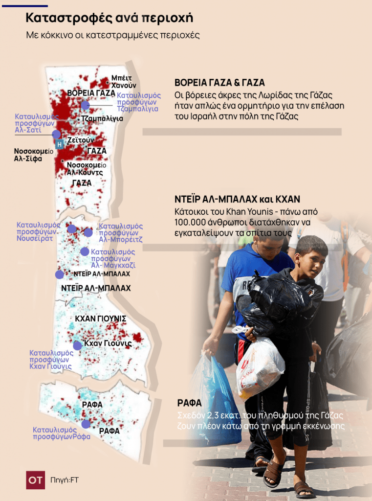 Το Ισραήλ επικεντρώνεται τώρα ανατολικά, μέσα στην πόλη της Γάζας, αλλά και στη νότια Γάζα. Το Σαββατοκύριακο, οι Παλαιστίνιοι ανέφεραν σφοδρούς βομβαρδισμούς στη Ζεϊτούν και στον προσφυγικό καταυλισμό Τζαμπάλια, ενώ τα Ηνωμένα Έθνη ανέφεραν ότι αρκετές εκρήξεις σημειώθηκαν σε σχολεία που αποτελούσαν καταφύγια αμάχων.