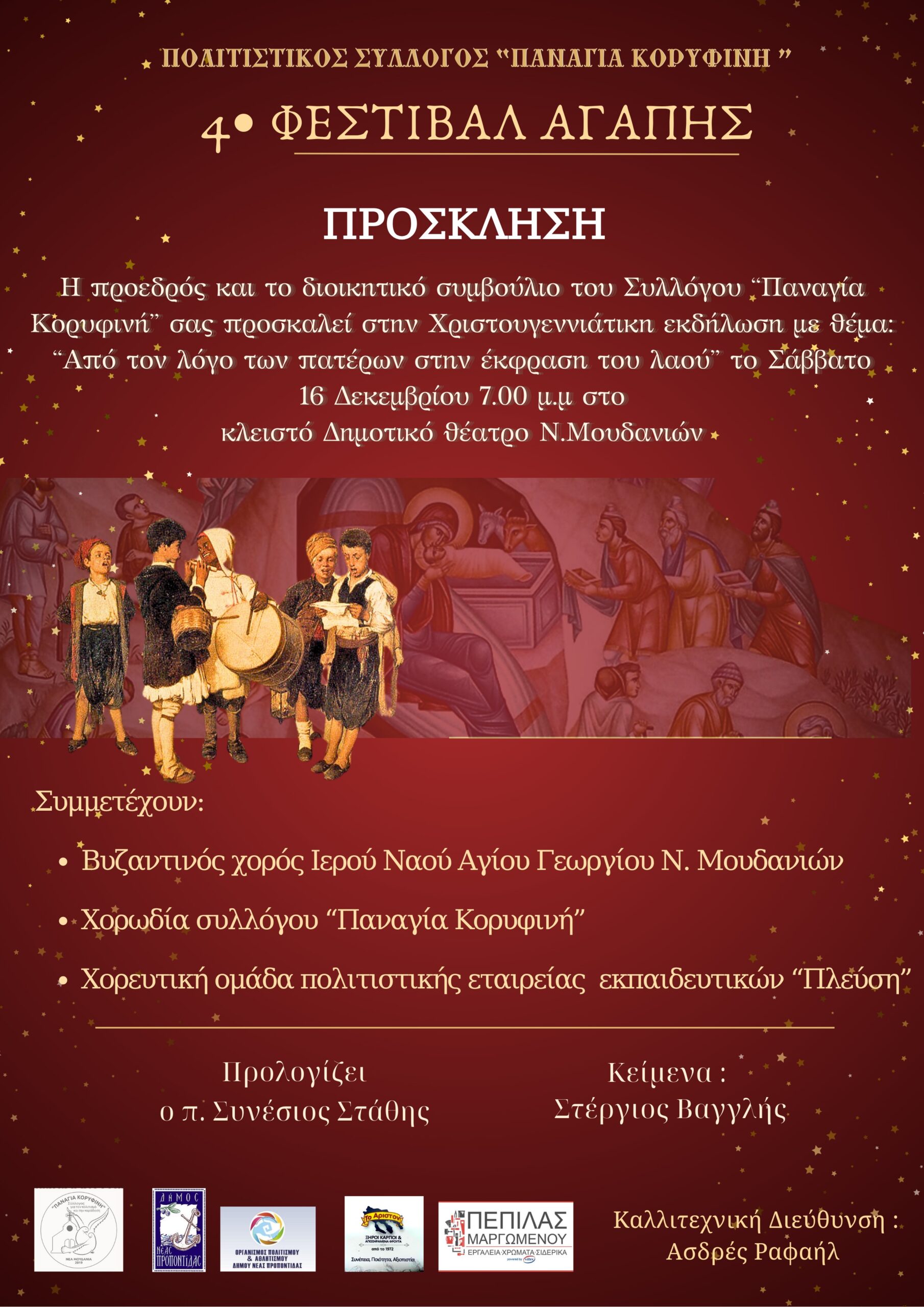 Ο Πολιτιστικός Σύλλογος ‘’Παναγία Κορυφινή‘’ σας προσκαλεί στο “4ο Φεστιβάλ Αγάπης”, Οδοιπορικό προς τα Χριστούγεννα: “Από τον λόγο των πατέρων στην έκφραση του λαού”, το Σάββατο 16 Δεκεμβρίου και ώρα 19:00 στο Δημοτικό Θέατρο Ν. Μουδανιών.
