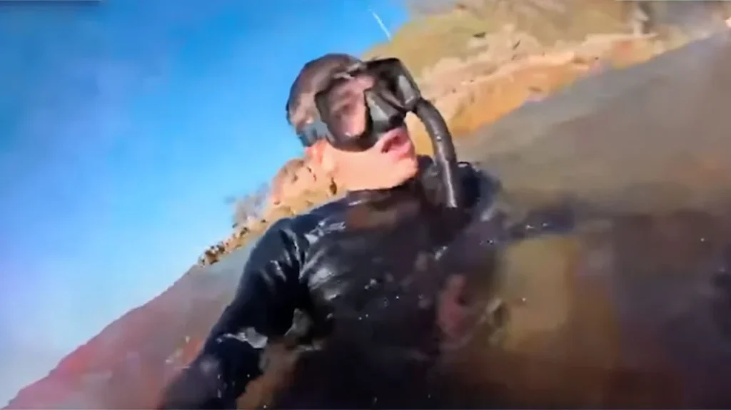 Στο βίντεο φαίνεται ο έντρομος 20χρονος να ζητά βοήθεια, ενώ η θάλασσα βάφεται κόκκινη από το αίμα του μετά το δάγκωμα του καρχαρία.