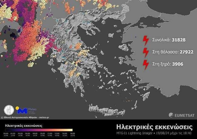 Τα στοιχεία του meteo.gr από τον ευρωπαϊκός μετεωρολογικό δορυφόρο τρίτης γενιάς MTG-I1, που φέρει όργανο καταγραφής των ηλεκτρικών εκκενώσεων (κεραυνοί και αστραπές) σε σχεδόν πραγματικό χρόνο, δείχνουν ότι την Δευτέρα, περίπου ως τις 18:400 καταγράφηκαν 31.828 εκκενώσεις.
