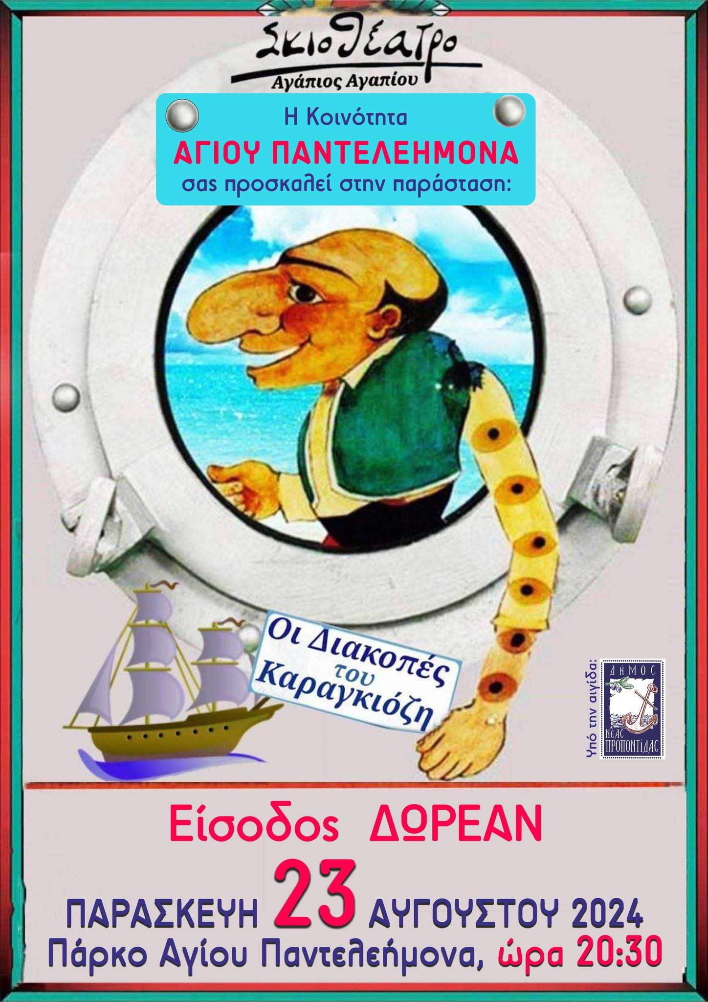 Η κοινότητα Αγίου Παντελεήμονα σας προσκαλεί στην παράσταση ‘’Οι Διακοπές του Καραγκιόζη’’, την Παρασκευή 23 Αυγούστου και ώρα 20:30 στο Πάρκο Αγίου Παντελεήμονα.