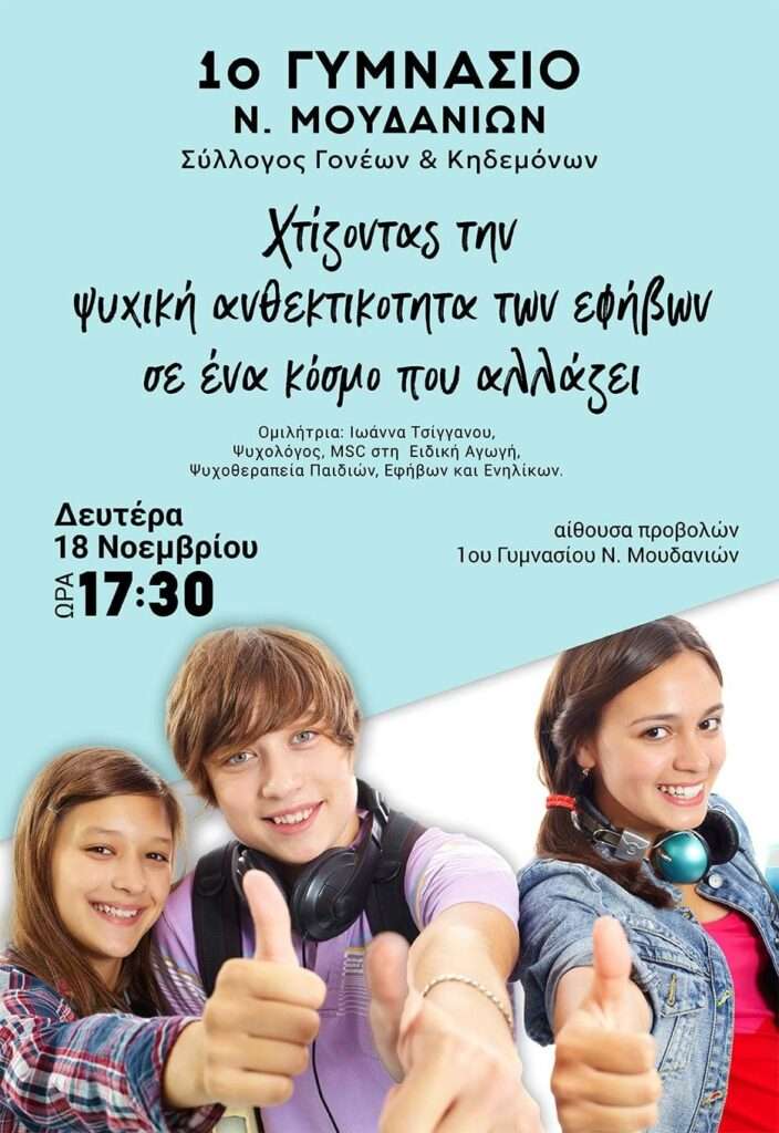 Ο Σύλλογος Γονέων και Κηδεμόνων του 1ου Γυμνασίου Ν. Μουδανιών σας προσκαλεί σε ενημερωτική εκδήλωση με θέμα: “Χτίζοντας την ψυχική ανθεκτικότητα των εφήβων σε έναν κόσμο που αλλάζει”, που θα πραγματοποιηθεί τη Δευτέρα 18/11 και ώρα 17.30 στην αίθουσα προβολών του 1ου Γυμνασίου.