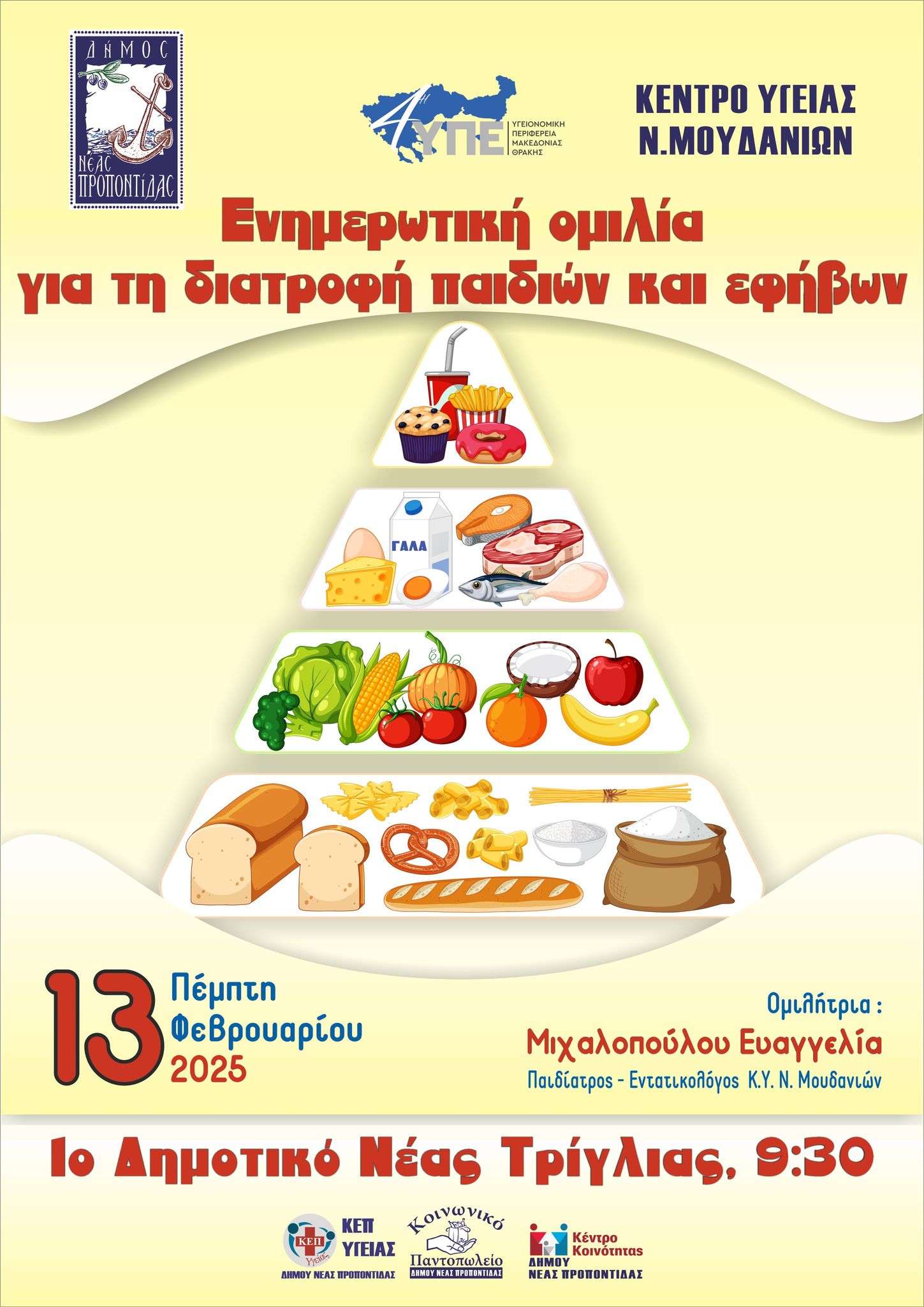 Ο Δήμος Ν. Προποντίδας και το Κέντρο Υγείας Ν. Μουδανιών σας προσκαλούν στην ενημερωτική ομιλία για τη διατροφή παιδιών και εφήβων με ομιλήτρια την παιδίατρο Μιχαλοπούλου Ευαγγελία , την Πέμπτη 13 Φεβρουαρίου 2025 και ώρα 9.30 στο 1ο Δημοτικό Σχολείο Ν. Τρίγλιας.