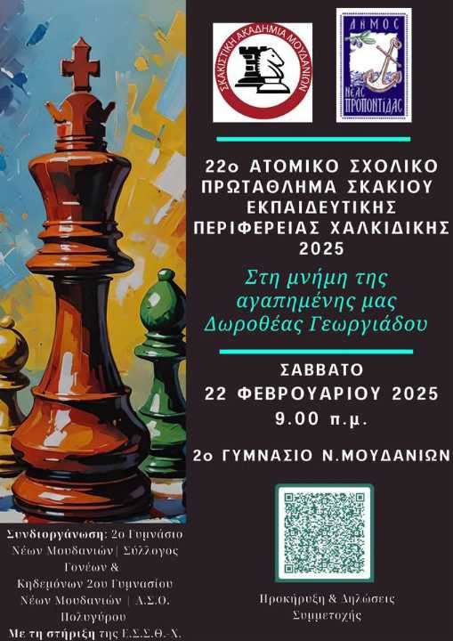 Η Σκακιστική Ακαδημία Προποντίδας, ο Δήμος Νέας Προποντίδας, το 2ο Γυμνάσιο Ν. Μουδανιών, ο Σύλλογος Γονέων και Κηδεμόνων του 2ου Γυμνασίου και το ΑΣΟ Πολυγύρου, με τη στήριξη των Σκακιστικών Σωματείων Θεσσαλονίκης-Χαλκιδικής, διοργανώνουν το Ατομικό Σκακιστικό Πρωτάθλημα Μαθητών-Μαθητριών Χαλκιδικής «Γεωργιάδου Δωροθέα», για να τιμήσει την αθλήτρια της σκακιστικής ακαδημίας που έχασε τόσο άδικα τη ζωή της το καλοκαίρι του 2024.