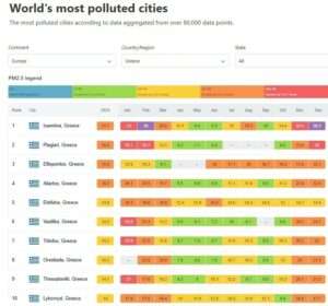Σύμφωνα με έκθεση της IQAir που παρακολουθεί την παγκόσμια ποιότητα του αέρα, εξέτασε συγκεκριμένα τα λεπτά σωματίδια, ή PM2.5, έναν από τους μικρότερους αλλά πιο επικίνδυνους ρύπους που συναντάμε στον αέρα.