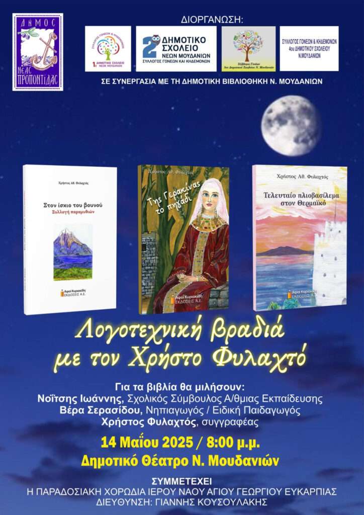Ο Δήμος Νέας Προποντίδας και οι Σύλλογοι Γονέων & Κηδεμόνων των Δημοτικών Σχολείων Ν. Μουδανιών, σε συνεργασία με τη Δημοτική Βιβλιοθήκη, σας προσκαλούν σε μια ξεχωριστή λογοτεχνική βραδιά με τον συγγραφέα Χρήστο Φυλαχτό.