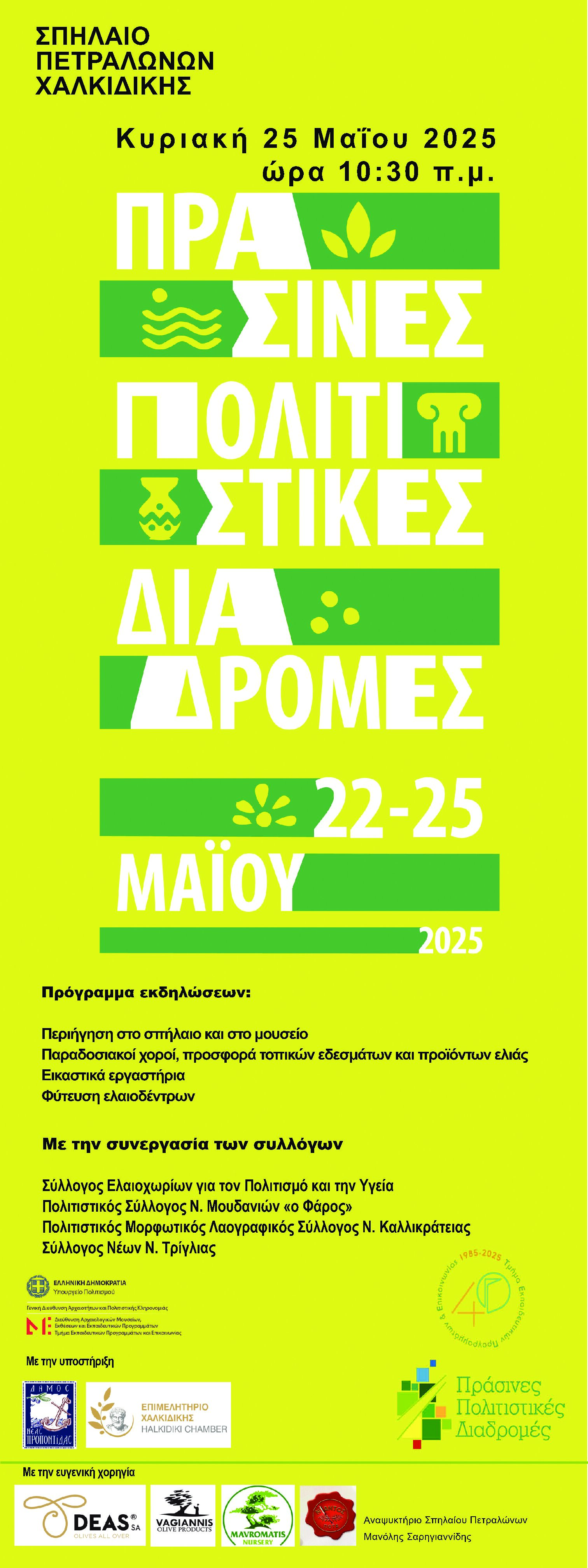 Η Εφορεία Παλαιοανθρωπολογίας–Σπηλαιολογίας στο πλαίσιο της δράσης «Πράσινες Πολιτιστικές Διαδρομές 2025» και σε συνεργασία με τοπικούς φορείς, διοργανώνει για μια ακόμη χρονιά, εκδηλώσεις στον αρχαιολογικό χώρο του Σπηλαίου Πετραλώνων Χαλκιδικής.