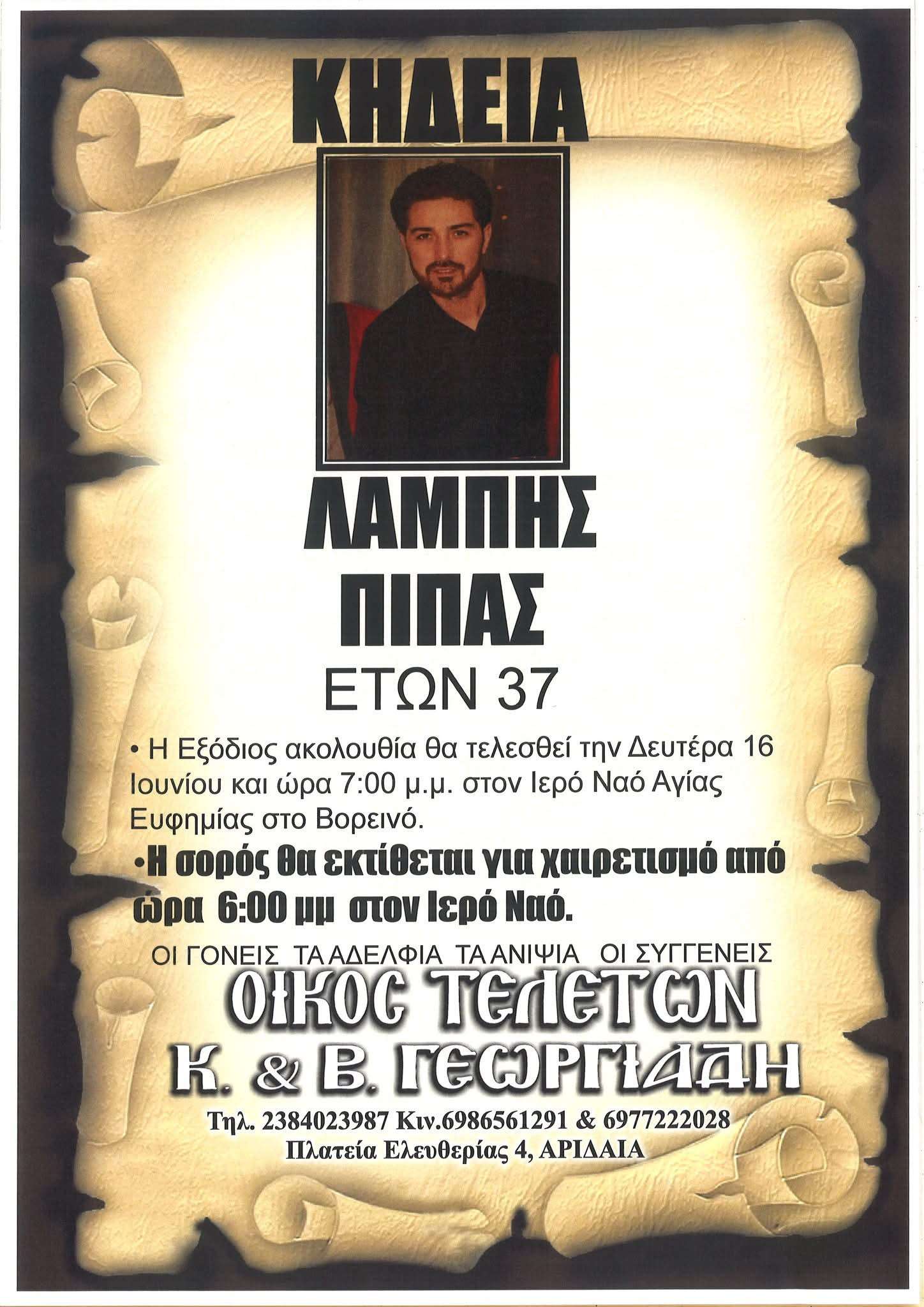 Όπως αναφέρει το pellanews.gr, ο Λάμπης Πίπα, άνθρωπος δραστήριος και κοινωνικός, είχε καταγωγή από το Βορεινό Αλμωπίας, όπου και θα τελεστεί σήμερα, Δευτέρα 16 Ιουνίου, η κηδεία του.