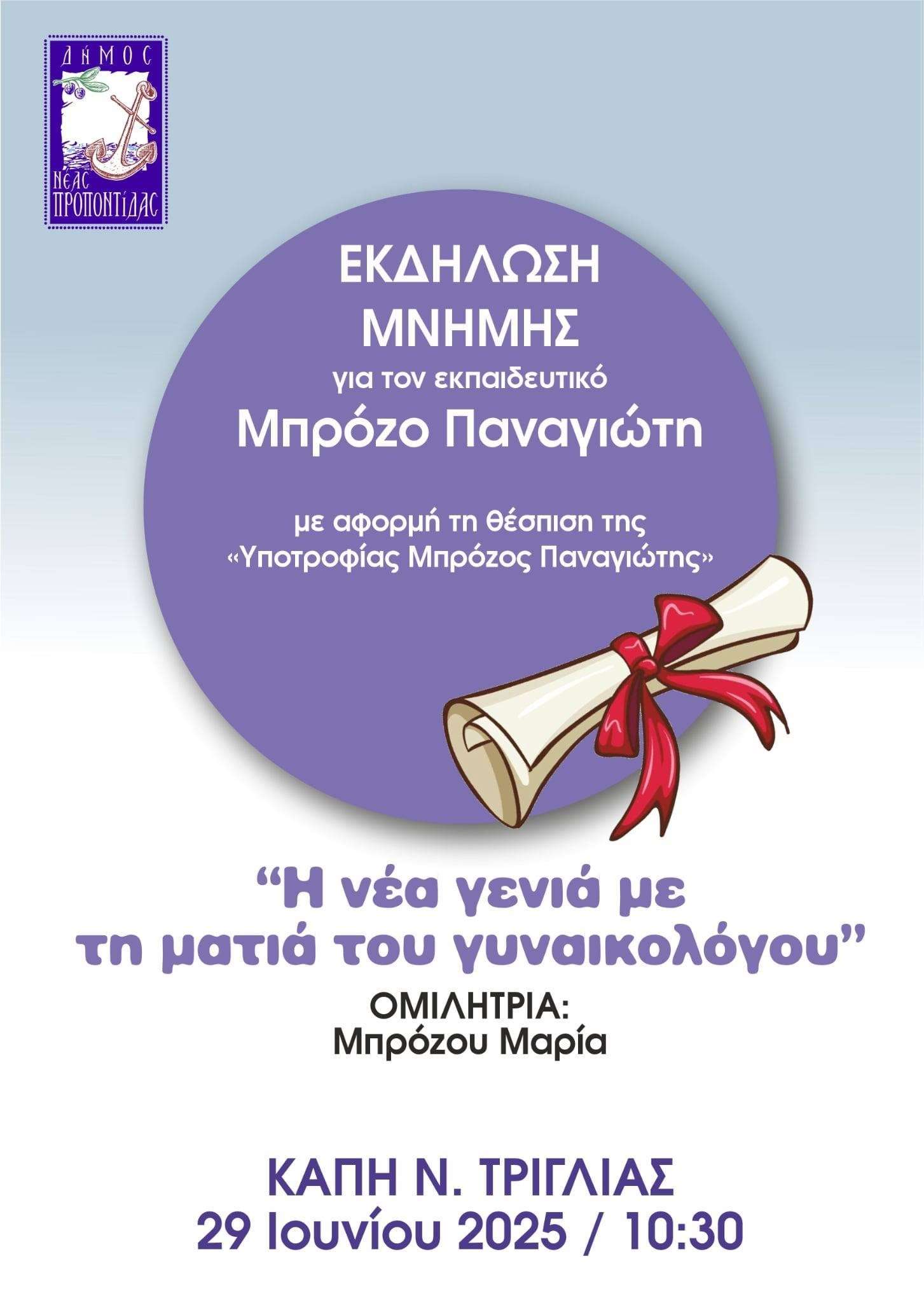 Ο Δήμος Νέας Προποντίδας τιμά τη μνήμη του εκπαιδευτικού Μπρόζου Παναγιώτη, με μια ξεχωριστή εκδήλωση που πραγματοποιείται με αφορμή τη θέσπιση της Υποτροφίας “Μπρόζος Παναγιώτης”, για την ενίσχυση και επιβράβευση νέων ανθρώπων.