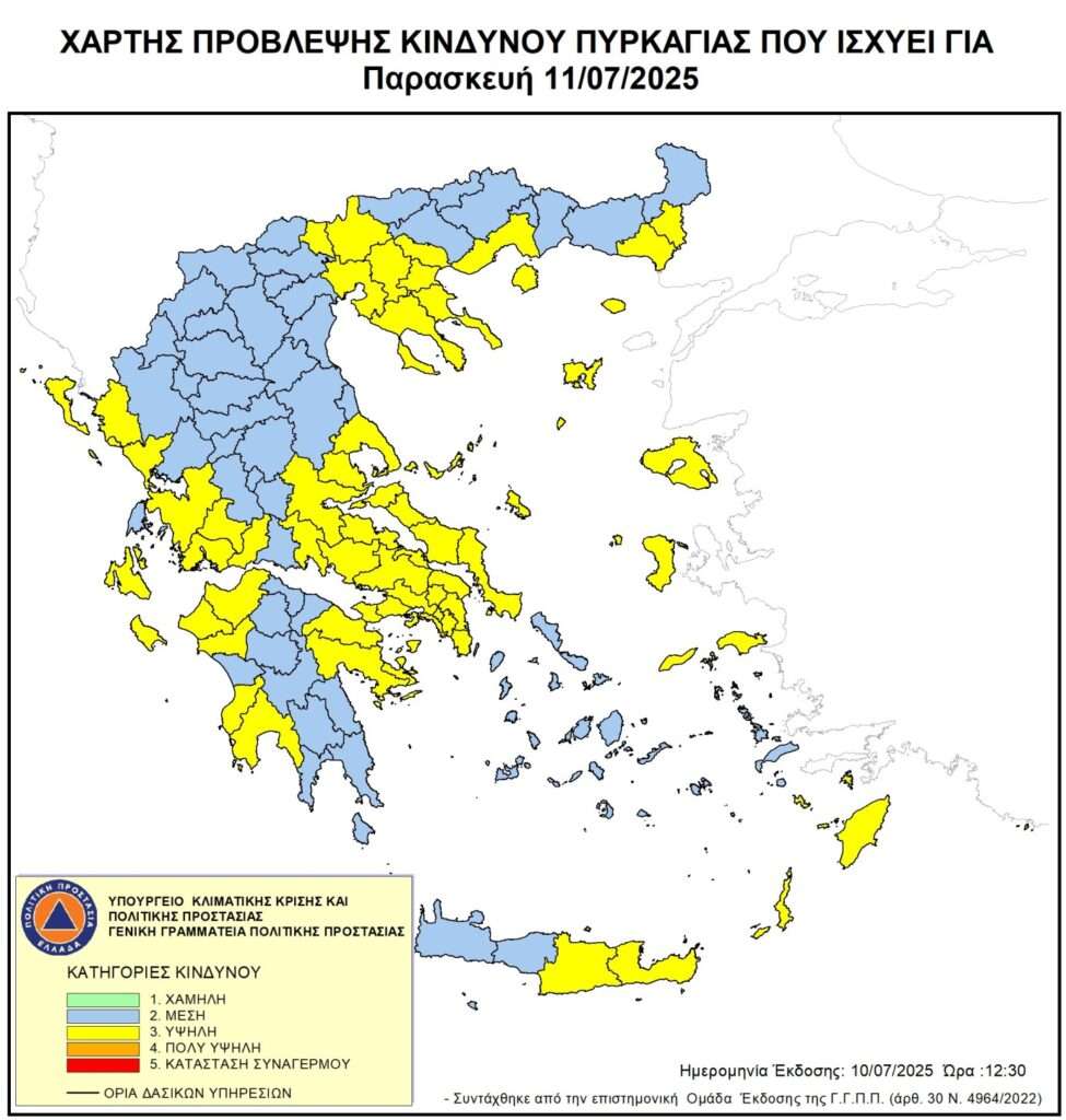 Σύμφωνα με τον Χάρτη Πρόβλεψης Κινδύνου Πυρκαγιάς που δημοσιεύει η Γενική Γραμματεία Πολιτικής Προστασίας του υπουργείου Κλιματικής Κρίσης και Πολιτικής Προστασίας (civilprotection.gov.gr), για αύριο προβλέπεται υψηλός κίνδυνος εκδήλωσης πυρκαγιάς (κατηγορία κινδύνου 3) σε Θεσσαλονίκη, Χαλκιδική, Κιλκίς και Καβάλα.