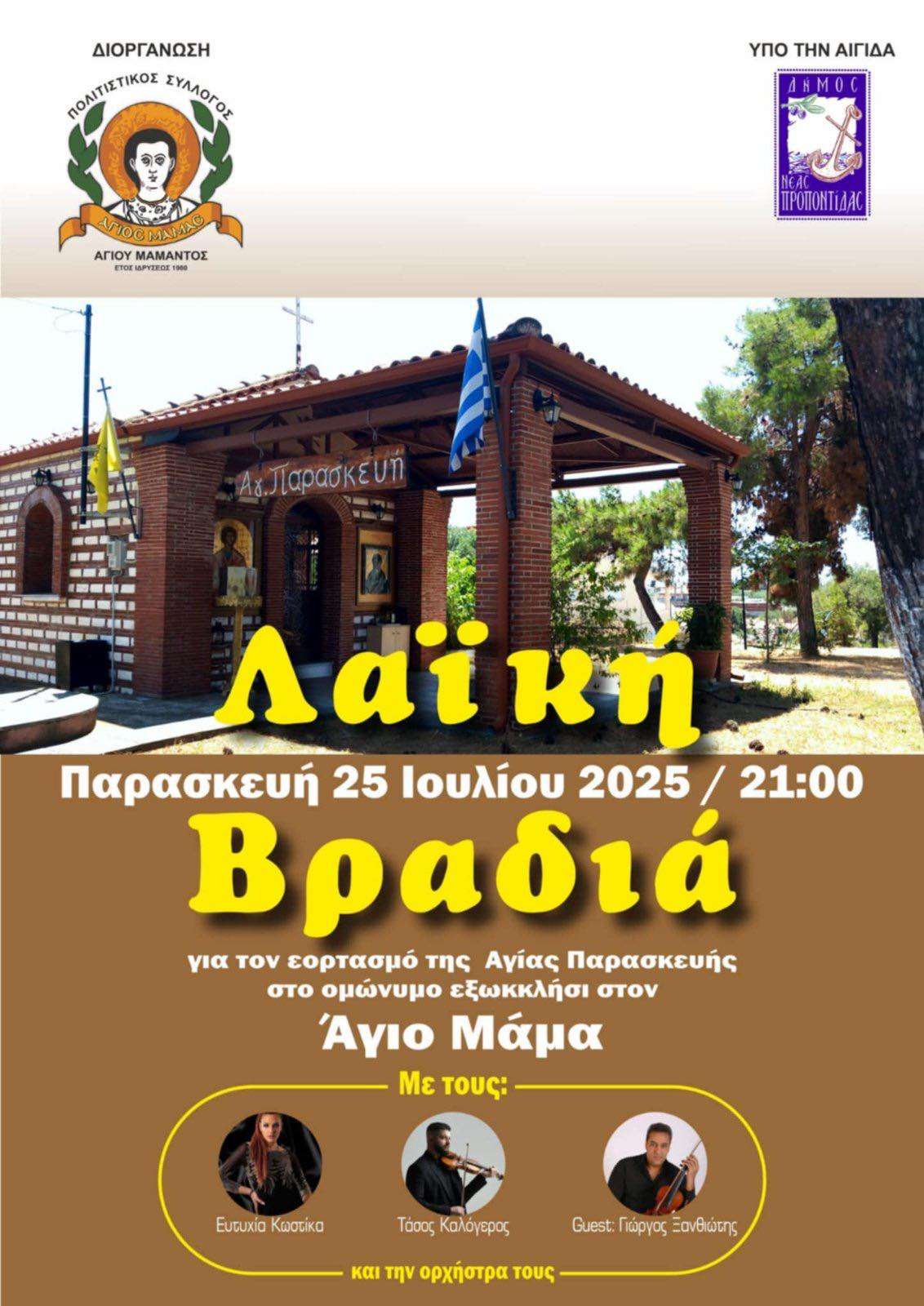 Ο Πολιτιστικός Σύλλογος Αγίου Μάμαντος σας περιμένει την Παρασκευή 25 Ιουλίου 2025 στις 21:00, στο εξωκλήσι της Αγίας Παρασκευής, για μια υπέροχη μουσική βραδιά με αφορμή τον εορτασμό της Αγίας Παρασκευής!