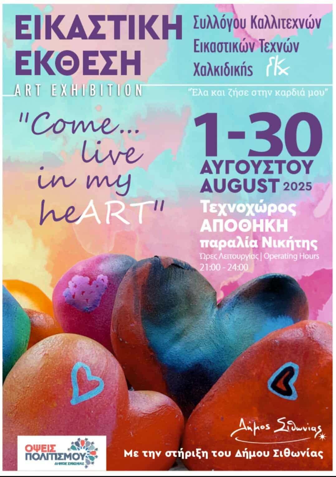 Ομαδική εικαστική έκθεση του Συλλόγου Καλλιτεχνών Εικαστικών Τεχνών Χαλκιδικής στον Τεχνοχώρο ΑΠΟΘΗΚΗ στη Νικήτη Χαλκιδικής απο 1 έως 30 Αυγουστου 2025 “Come..live in my heART”.