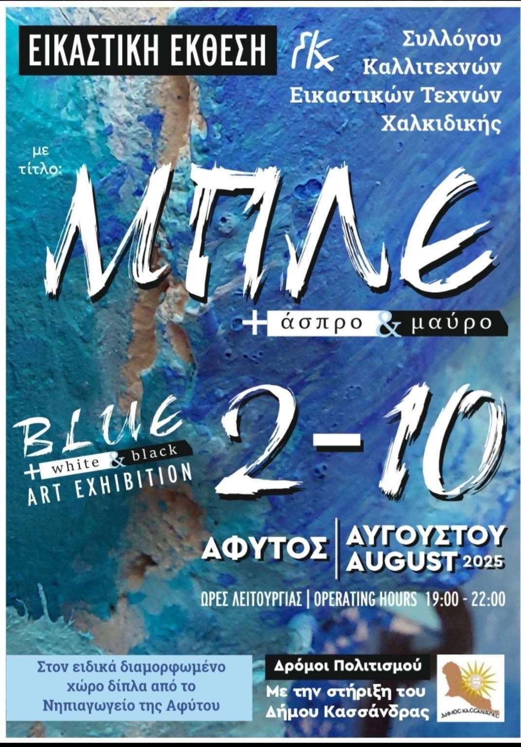Στο πλαίσιο των Δρόμων Πολιτισμού του Φεστιβάλ Κασσάνδρας, ο Σύλλογος παρουσιάζει μια νέα εικαστική έκθεση με τίτλο «Μπλε + Άσπρο & Μαύρο», που φιλοδοξεί να συγκινήσει και να εμπνεύσει το κοινό μέσα από την έντονη εικαστική αντίθεση και τη δύναμη του ελληνικού τοπίου.