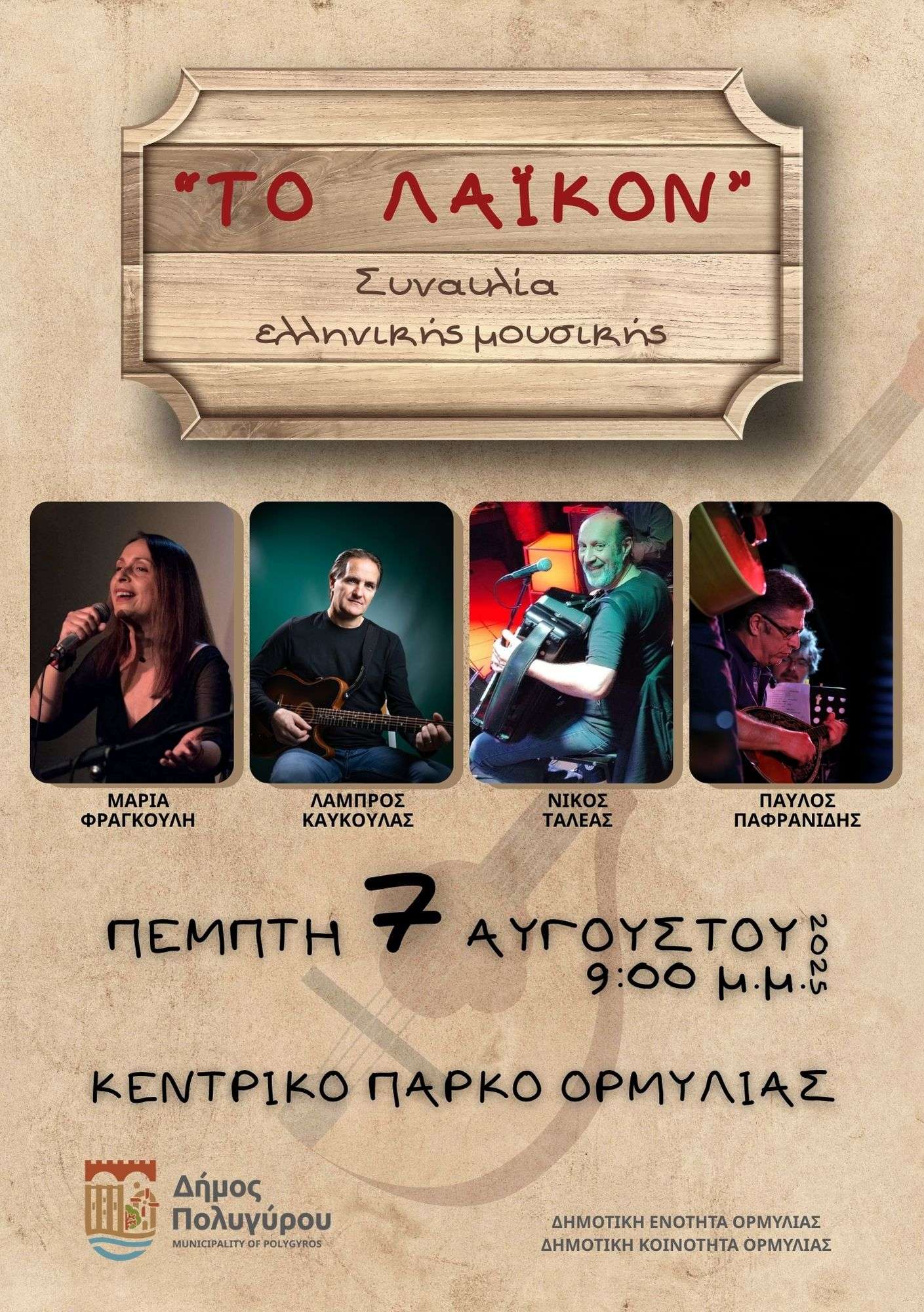Συναυλία «ΤΟ ΛΑΪΚΟΝ» στην Ορμύλια – Γιορτή ελληνικής μουσικής στο Κεντρικό Πάρκο