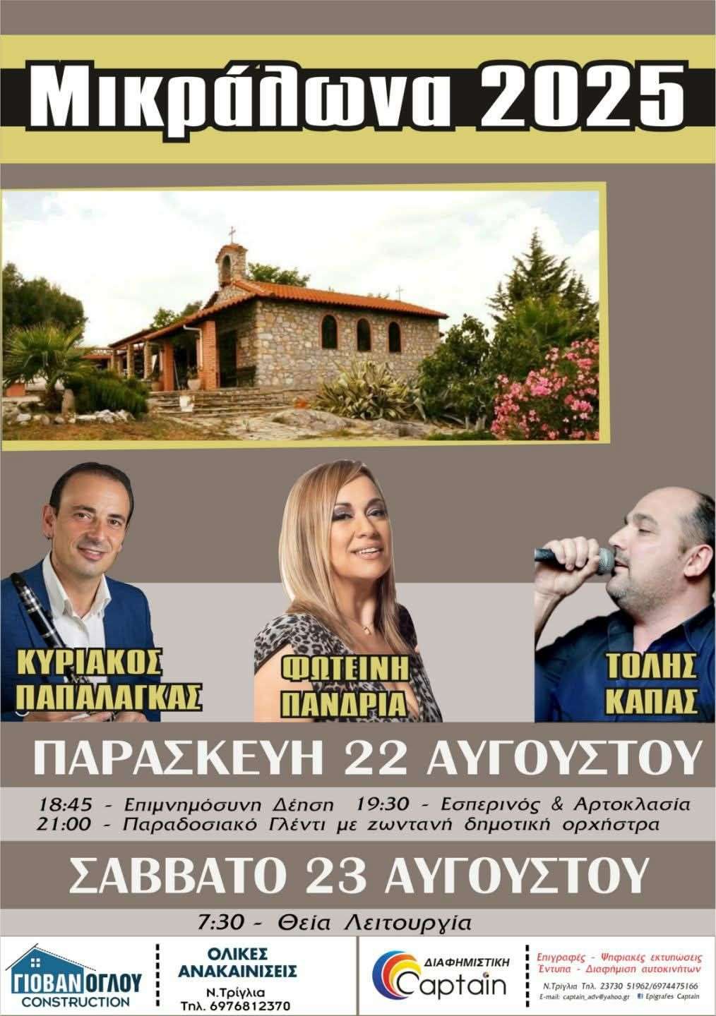 Ο Πρόεδρος και το Διοικητικό Συμβούλιο του Πολιτιστικού Συλλόγου «Τα Μικράλωνα» προσκαλούν κατοίκους και επισκέπτες να συμμετάσχουν στις διήμερες εκδηλώσεις που θα πραγματοποιηθούν την Παρασκευή 22 και το Σάββατο 23 Αυγούστου 2025, στην περιοχή Μικράλωνα, της Δημοτικής Ενότητας Τρίγλιας, Δήμου Νέας Προποντίδας, στη Χαλκιδική.