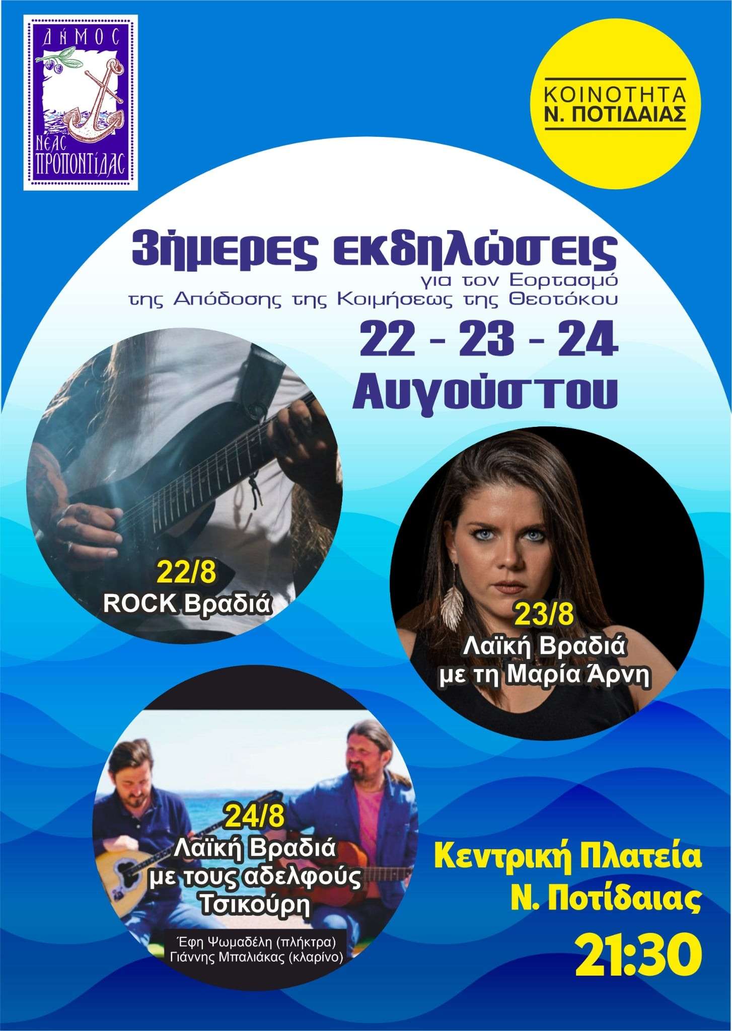 Ο Δήμος Νέας Προποντίδας και η Κοινότητα Νέας Ποτίδαιας σας καλούν σε μια ανεπανάληπτη τριήμερη γιορτή, από τις 22 έως τις 24 Αυγούστου 2025, στην Κεντρική Πλατεία Νέας Ποτίδαιας. Οι βραδιές θα γεμίσουν με μουσική, κέφι και καλοκαιρινή ενέργεια, προσφέροντας μοναδικές στιγμές σε κατοίκους και επισκέπτες.