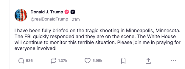 Ο δήμαρχος της Μινεάπολης, Τζέικομπ Φρέι, σημείωσε σε ανάρτηση στην πλατφόρμα Χ ότι παρακολουθεί στενά τις εξελίξεις, βρίσκεται σε συνεχή επικοινωνία με τον αρχηγό της αστυνομίας και έχει ενεργοποιηθεί η ομάδα άμεσης επέμβασης. «Θα μοιραστούμε περισσότερες πληροφορίες μόλις μπορέσουμε. Παρακαλώ δώστε στους αστυνομικούς μας τον χώρο που χρειάζονται για να ανταποκριθούν στην κατάσταση», τόνισε.